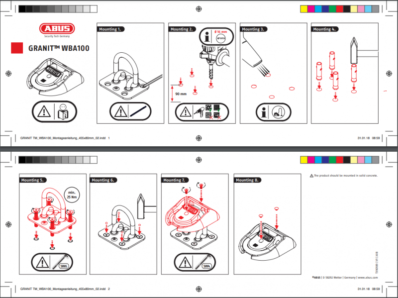 Golvöglan WBA 100 bultas fast i betonggolvet med fyra stycken expanderbultar (medföljer). Därefter slås fyra härdade stålkulor i skruvskallen, vilket gör att golvöglan inte går att ta bort.
