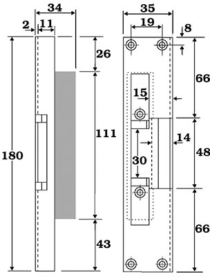 Monteringsstolpe 511 för enkelt elslutbleck. Kan användas i trä-, stål- och aluminiumkarmar samt tillsammans med dubbelfallås monterat i dörrblade