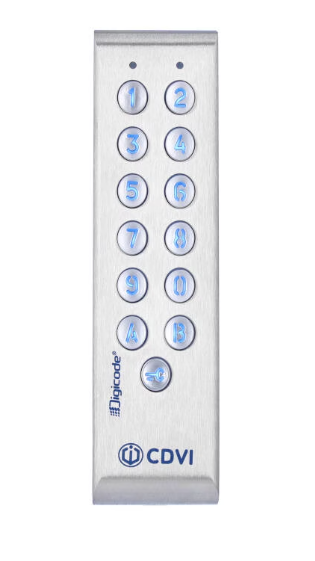 Smalprofilskodlås tillverkat i rostfritt stål för styrning av två dörrar. Kodlåset är ett utanpåliggande och kompakt montage. Elektroniken är inkapslad för att öka vandalskyddet och är 100% vattentät. Bakgrundsbelysta knappar med justerbar belysningstid. Kodlåset klarar upp till 100 st valfria fyr- eller femsiffriga användarkoder. Kodlåset har två reläutgångar samt ingång för extern tryckknapp.