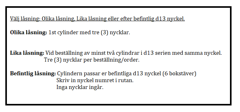 Observera! Vid val av lika låsning eller befintlig låsning tillverkas låscylindrarna utifrån din beställning, vilket innebär dels en något längre leveranstid, dels att ångerrätten inte gäller.