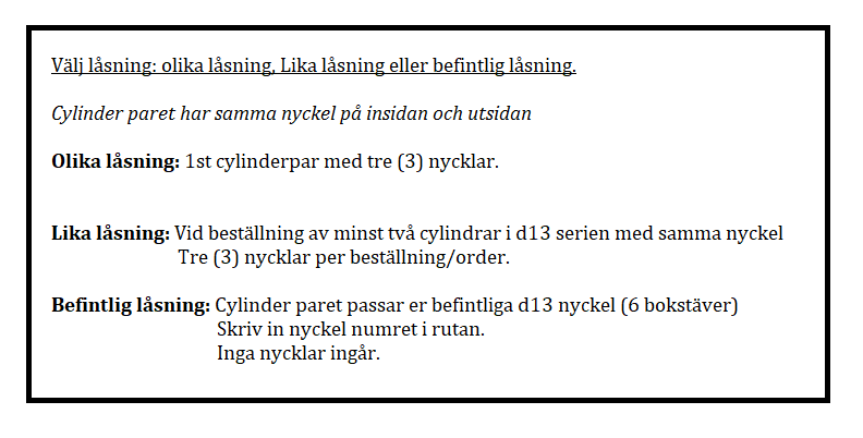 Vänligen observera att vid beställning av – Befintlig nyckel och Lika låsning tillverkas låsen efter din önskan, Vilket innebär en någon längre leveranstid samt att det inte är möjligt att returnera dessa.