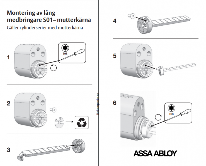 Montering. Man lossnar skruven bak på cylindern vid medbringaren och man fäster denna medbringare över den befintliga korta medbringaren och skruvar tillbaka skruven.