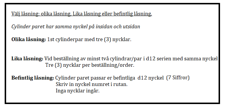 Observera! Vid val av lika låsning eller befintlig låsning tillverkas låscylindrarna utifrån din beställning, vilket innebär dels en något längre leveranstid, dels att ångerrätten inte gäller.