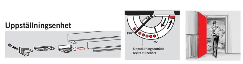 Uppställningsenheten ställd in för uppställning av dörr (ej branddörr) mellan 75 och 150 grader. Används till höger - och vänsterdörr. Dörrens öppnas och ställs automatikst i öppet läge. Hållkraften ställs in efter dörrbredd. Funktionen kan med ett enkelt grepp från- eller till kopplas.