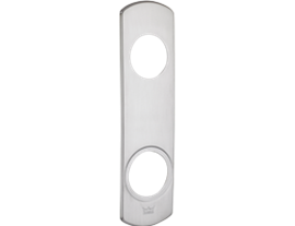 Täckskylt för dörrar med låshustyp modul, för att täcka urtag vid låsbyte samt eventuella skador på dörren. Kläms mellan dörrblad och cylinderbehör och dörrtrycke.