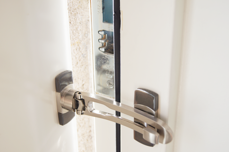 Förr dörrspärren i sidled mot dörren, spärren frifös från karmbeslaget och dörren kan öppnas. För sedan spärren nedåt så ofrivillig aktivering av spärren omöjliggörs