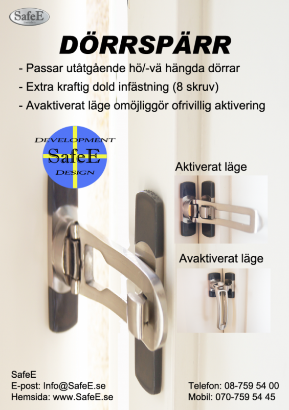 Designad dörrspärr som begränsar dörrens öppning i säkrat läge!