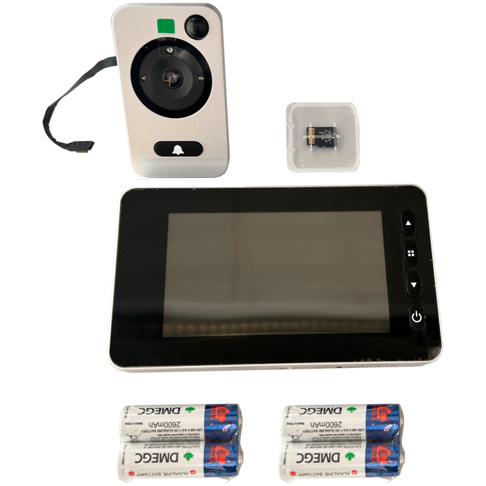 Det digitala dörrögat med ringklocka. 110° vidvinkel oavsett dörrtjocklek, 38-110mm. 4 xAA batterier ingår / räcker till ca 2000 visningar. SD kort 4GB sparar 4800 bilder. 4,3” LCD skärm. Snygg och klassisk design såväl på insidan som utsidan