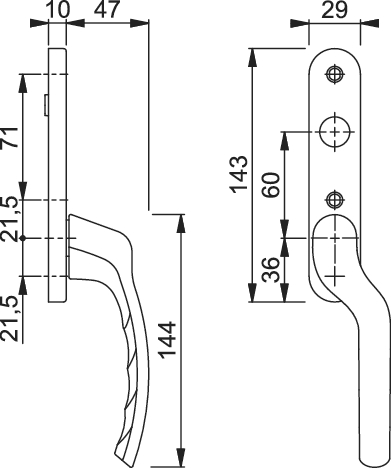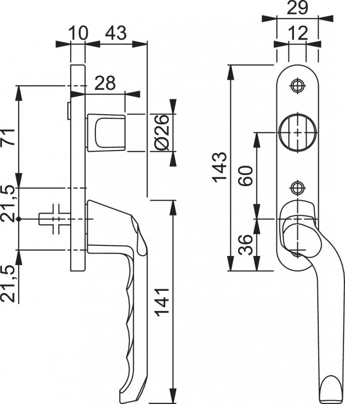HOPPE 350KL fönsterhandtag av aluminium F1, med långskylt och vred, för fönsterdörrar med låsbar spanjolett