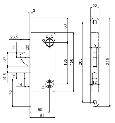 Låshus 411-50 för entrédörrar, skjut- och pendeldörrar försedda med draghandtag/tryckplatta. Uppfyller fordringar enligt Svensk Standard SS 3522, klass 3. Ingår i av försäkringsbolag godkänd låsenhet. Automatisk förregling av hakregel vid 360° nyckelvridning. Härdad och tvångsstyrd hakregel