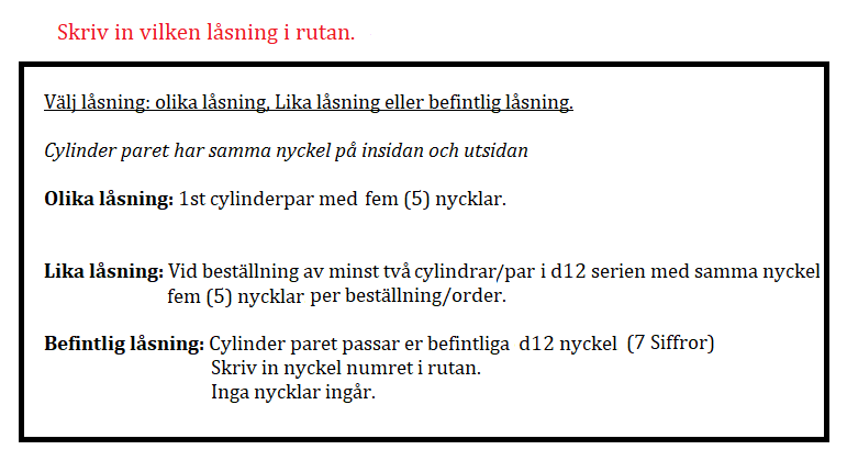 Vänligen observera att vid beställning av lås tillverkas låsen efter dina nycklar, Vilket innebär en någon längre leveranstid samt att det inte är möjligt att returnera dessa. detta gäller även vid beställning av lika låsning av lås.