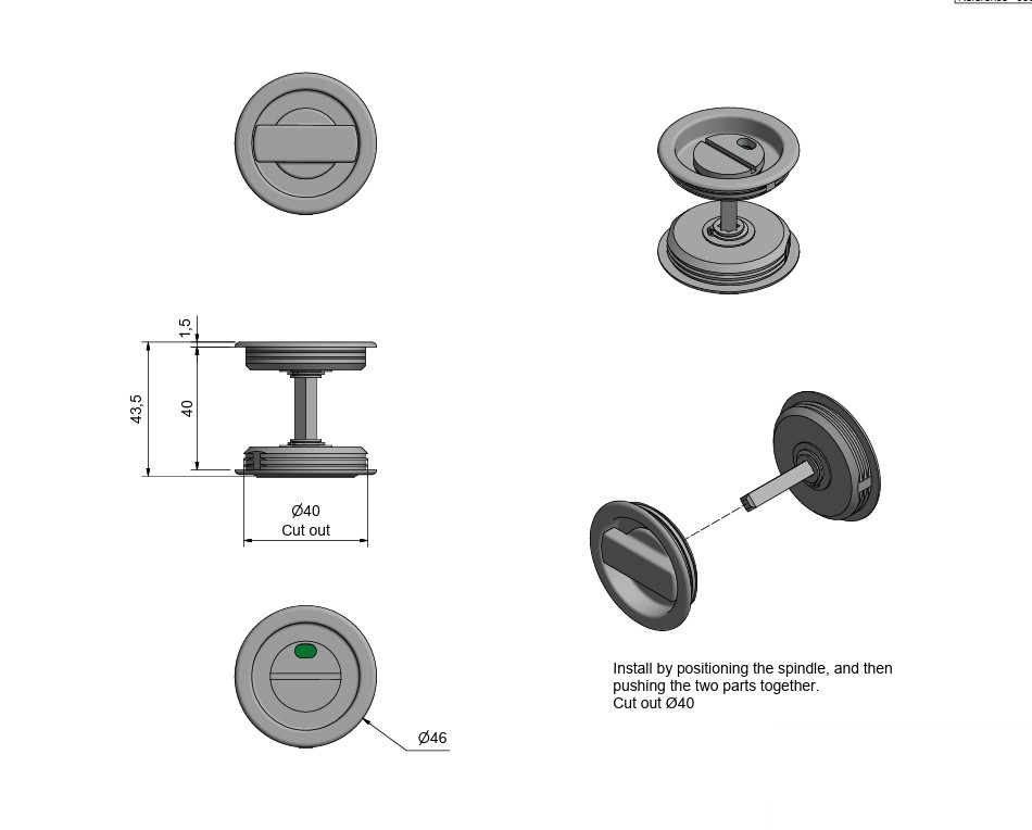 Toalettlås för skjutdörrar, Beslaget innehåller 2 st skjutdörrshandtag för hål med Ø 40 mm, invändigt handtag samt utvändig skål med upptaget/ledigt-markering