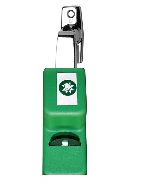 Utrymningskåpa i grön plast. Monteras över nederdelen på fönsterdörr/fönsterhandtag. Låses fast med hänglås. Avsett att markera utrymningsväg/öppning.