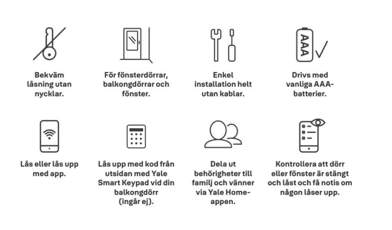 - Smart Keypad (tillval): Möjligt att låsa upp och öppna balkongdörren med tillvalet Yale Smart Keypad om mekaniskt handtag finns på utsidan.